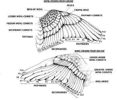 This diagram (Used with permission) and the instructions are provided as a guide for the pet bird owner who has been instructed and training by an experienced breeder or vet as to wing feather trimming. Do not attempt to trim your birds wing feathers alone or without proper training. Until you have been shown how to do this several times you should not attempt to trim your bird at all.